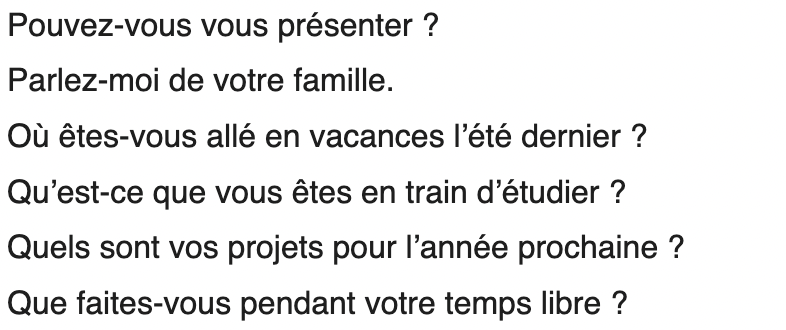 Lâexaminateur cherche Ă Ă©valuer ta capacitĂ© Ă te prĂ©senter et Ă parler de sujets diffĂ©rents.