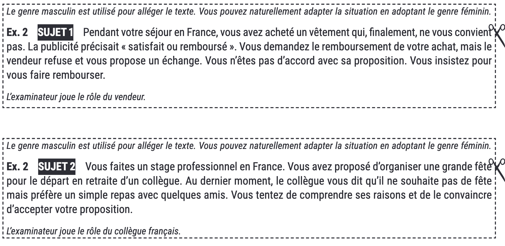 Attention : dans certains cas (sujet 1), tu devras vouvoyer lâexaminateur. Dans dâautres cas (sujet 2), il te faudra le tutoyer